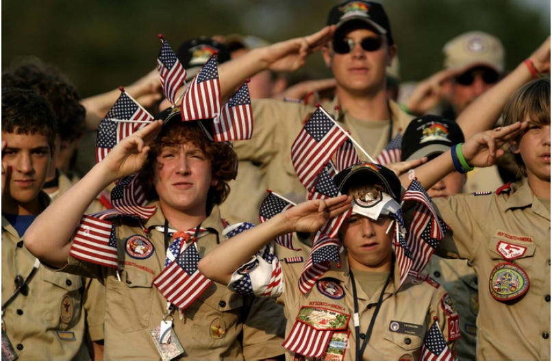 Otherwise, the rats wouldn’t eat it. But at the core of scouting is a hidden curriculum of the flag worship of the pre-militarization of getting you into the uniform. And so it’s a government-sponsored affiliated youth program where the kids are going to receive awards, either Cub Scout Adventure Loops or Boy Scout Merit Badges for regurgitating the doctrine of the religion And then again, there’s going to be social pressure placed on them to participate.