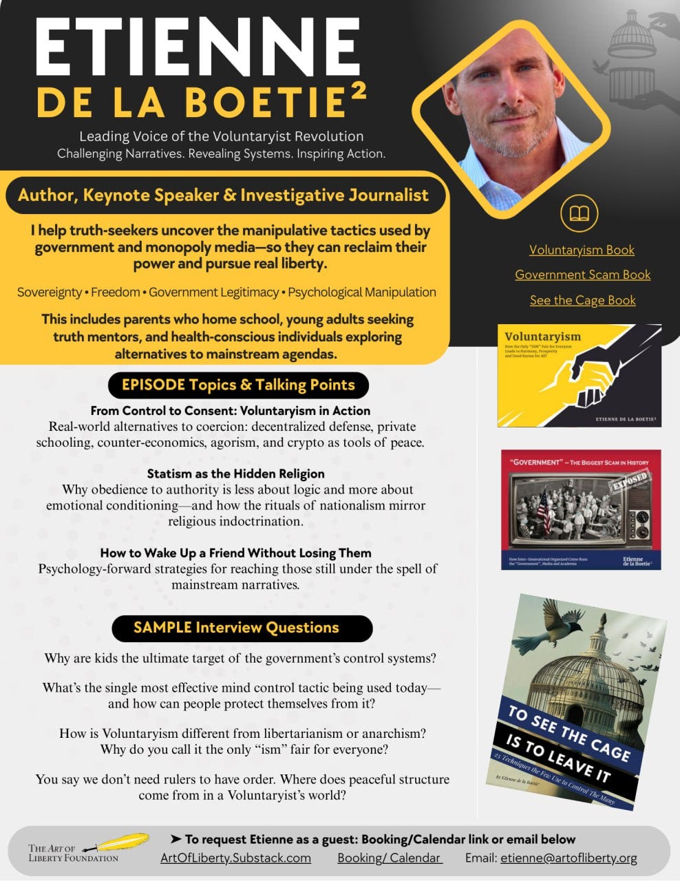 I have a little media campaign going on for my new book: To See the Cage is to Leave It – 25 Techniques the Few Use to Control the Many. The image below is my one-pager for podcast and radio talk show hosts. Can you help me forward this along to your favorite hosts? Some shows I’d like to do: Joe Rogan, Patrick Bet-David, Jimmy Dore, Redacted, Kim Iversen, David Knight, Theo Von, Breaking Point, Chris Martensen, Neil Oliver, Sabby Sabs, and Diary of a CEO. If anyone has any “Ins” it would be greatly appreciated!