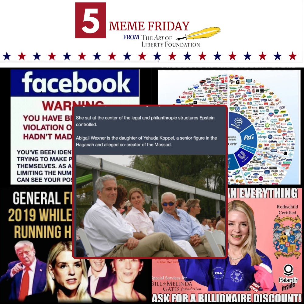 Well.. We are late getting out Five Meme Friday and in the interim Israeli puppet Donald Trump has launched a war with Iran for Israel. Secretary of State Marco Rubio said publicly that we attacked Iran because we knew Israel was going to attack Iran: “we knew that there was going to be an Israeli action, we knew that that would precipitate an attack against American forces, and we knew that if we didn’t preemptively go after them before they launched those attacks, we would suffer higher casualties.”