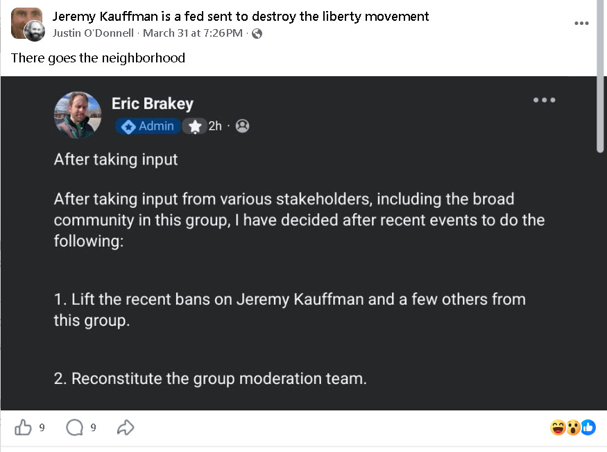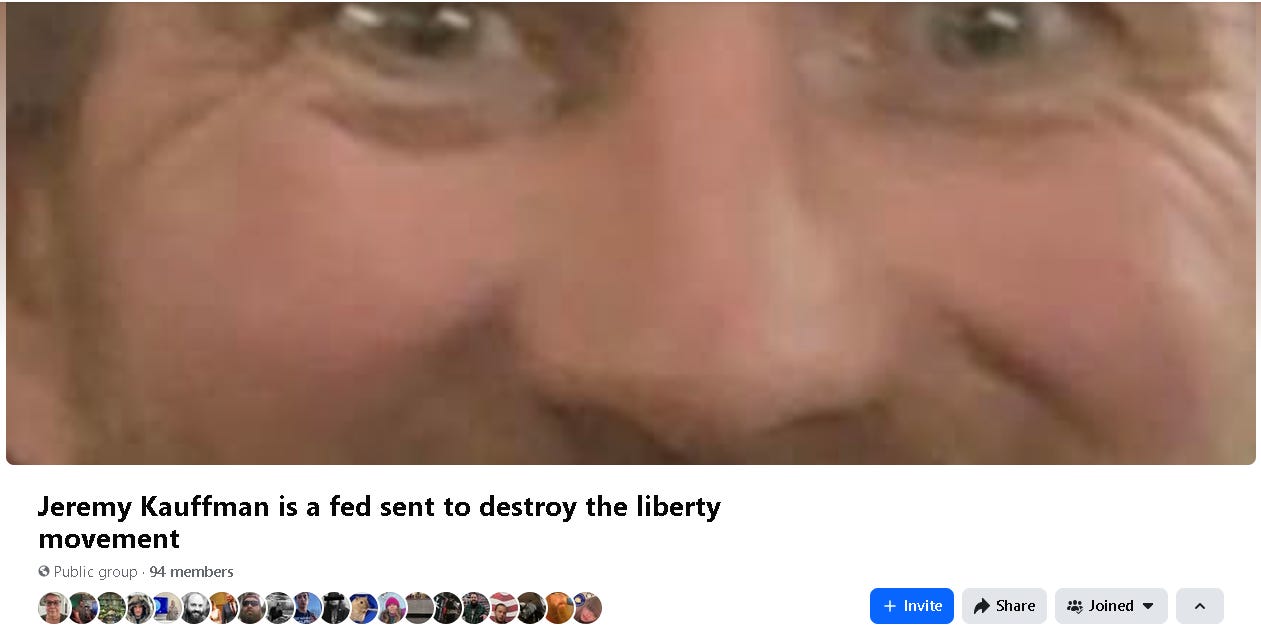 There is a Facebook Group Called: Jeremy Kauffman is a Fed Sent to Destroy the Liberty Movement.