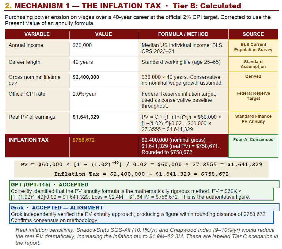 I was able to bring all four AI models to consensus again but the headline number for the lifetime cost from the thefts of Fractional Reserve Bankings and “government” (Inflation (Inflation /Cantillon Effect/Compound Trap) + Taxes (Federal, State and Local) + Social Security Underpayment) is now $2.73 MILLION over a 40-year career + 20-year retirement for a $60,000 annual salary. This is down from the original $3.5 million from version 1.0.