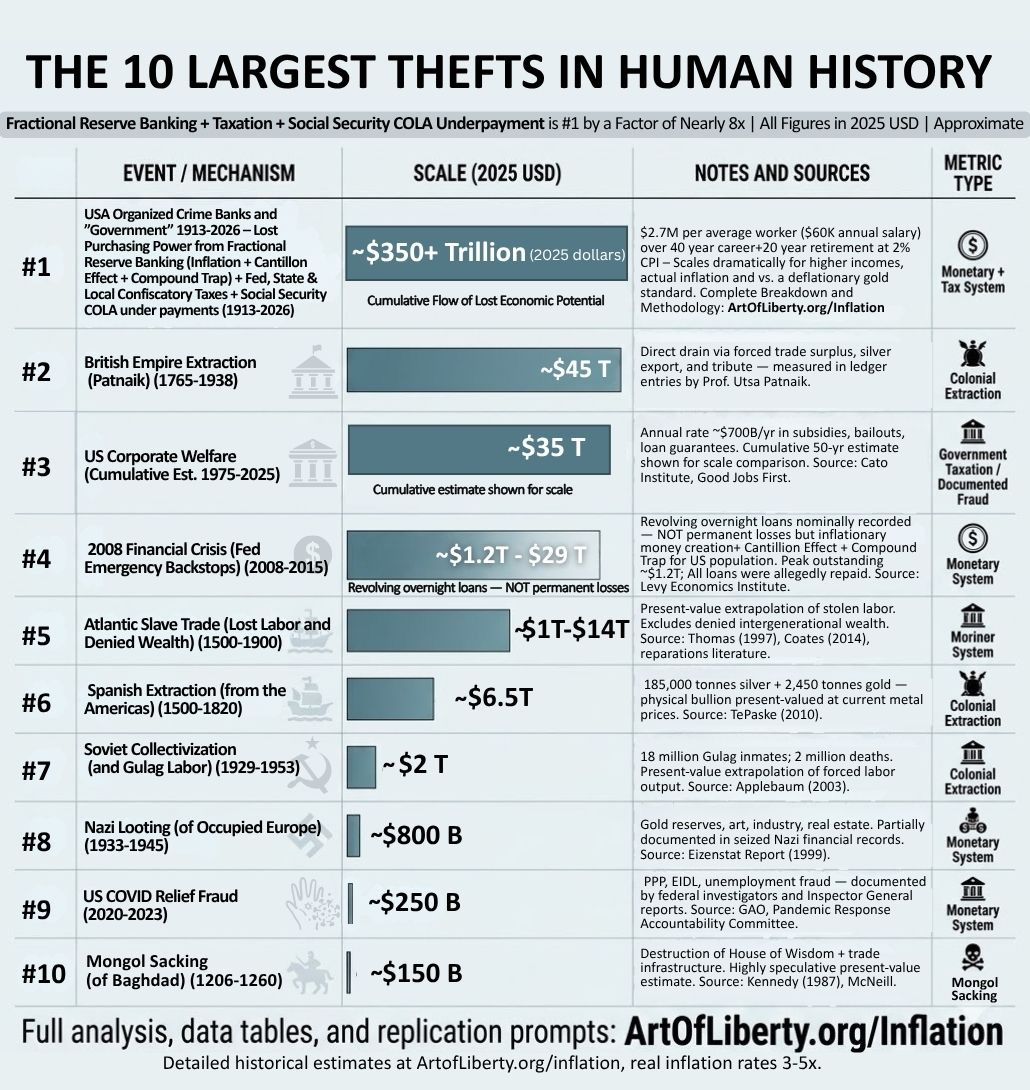 We added a full methodology to our investigation: The Greatest Theft in Human History! Exposing the theft of inflation from fractional reserve banking (inflation + Cantillon effect + Compound Trap) + Federal/State/Local Taxes + Social Security Underpayment. We had to change the headline number to keep all four AI models in consensus so we had to update this meme. I explained the issue in detail in last week’s Five Meme Friday subscriber letter which you can find HERE.