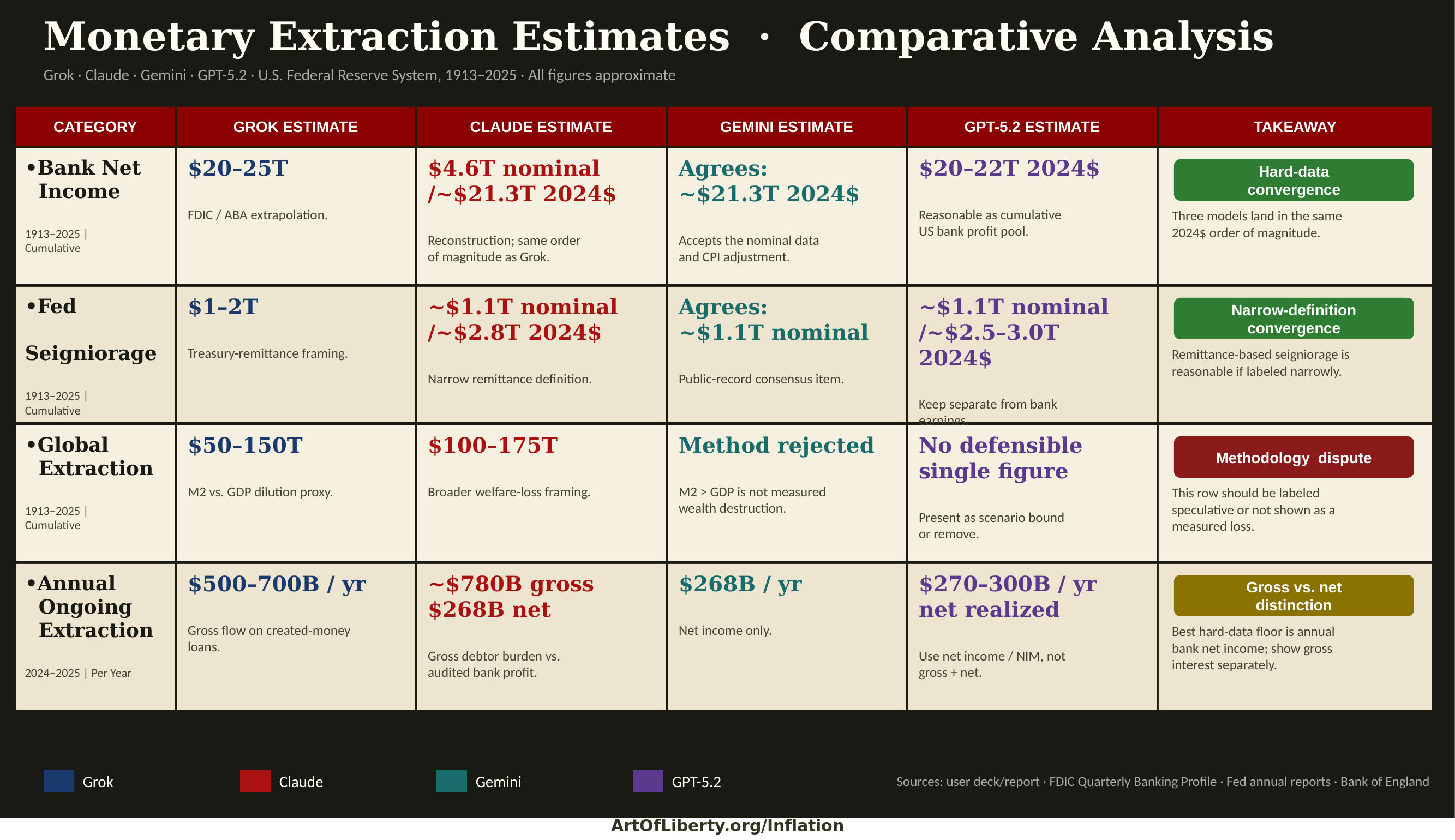 This is not a political opinion. It is not a conspiracy theory. It is an accounting — calculated independently by four separate AI systems using audited primary-source data from the FDIC, the Federal Reserve, the BLS, and the GAO. When Claude, Grok, Gemini, and GPT-5.2 all produce the same order of magnitude without coordination, the pattern is not noise. It’s signal.