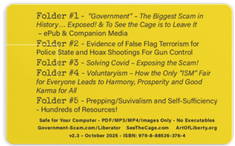1. “Government” – Companion media to “Government” – The Biggest Scam in History… Exposed! and To See the Cage is to Leave It – 25 Techniques the Few Use to Control the Many including the ePub versions of both “Government” and To See the Cage, the full-scale visualizations, and evidence supporting the book including documentaries, short videos, 1200+ dank memes, and truth music from the liberty movement’s leading artists.