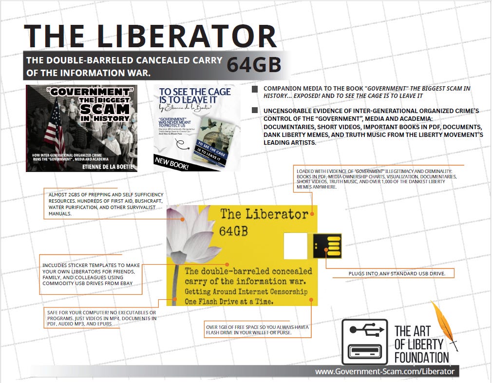 The Liberator – A 64GB uncensorable, credit card-sized flash drive crammed with evidence of “government” and media criminality. that can be easily copied for friends, relatives, and colleagues.