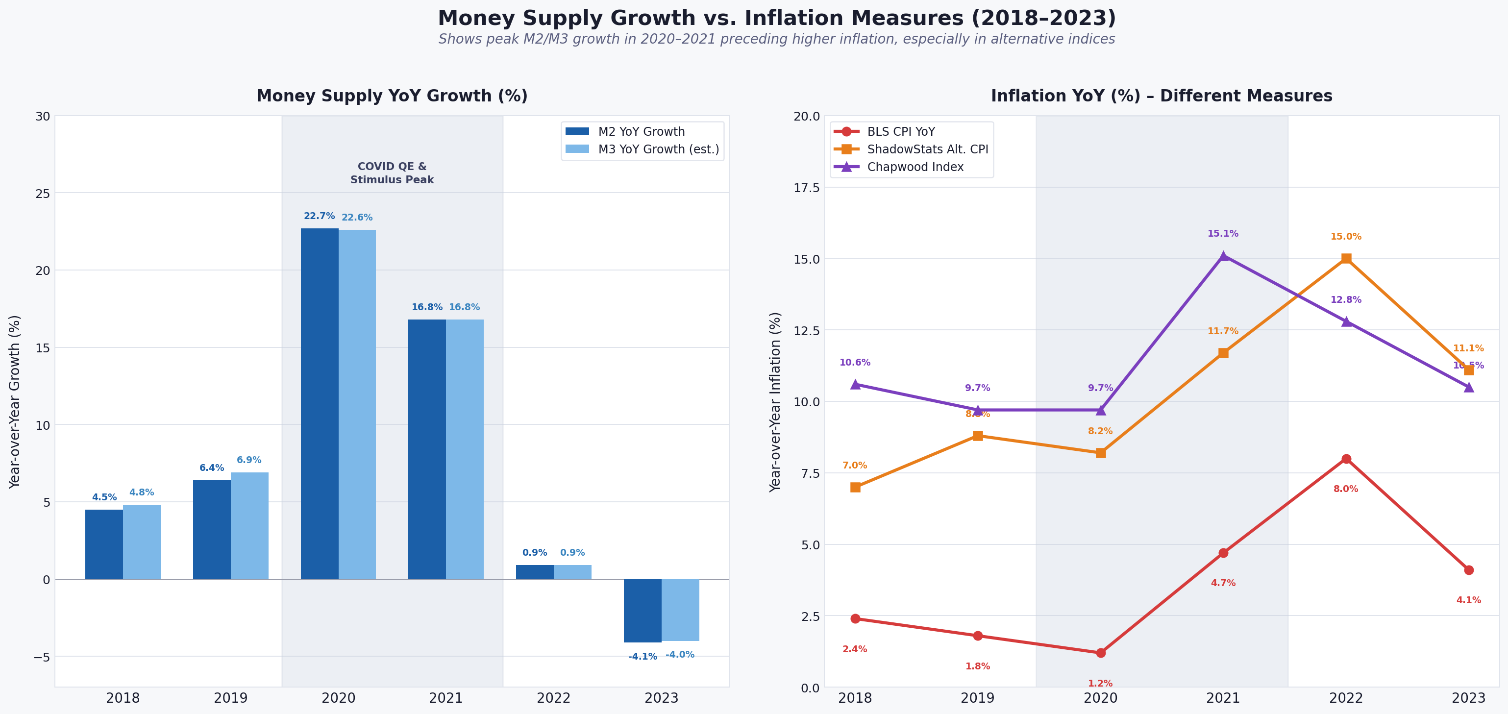 Graph showing the effect that the increase in the money supply from Federal Reserve Covid 19 “Quantitative Easing” of which created $4.06 Trillion in 2020 and $1.93 Trillion in 2021, causing an immediate inflationary effect in subsequent years using inflation statistics from the Bureau of Labor Statistics, ShadowStats.com and the Chapwood Index.