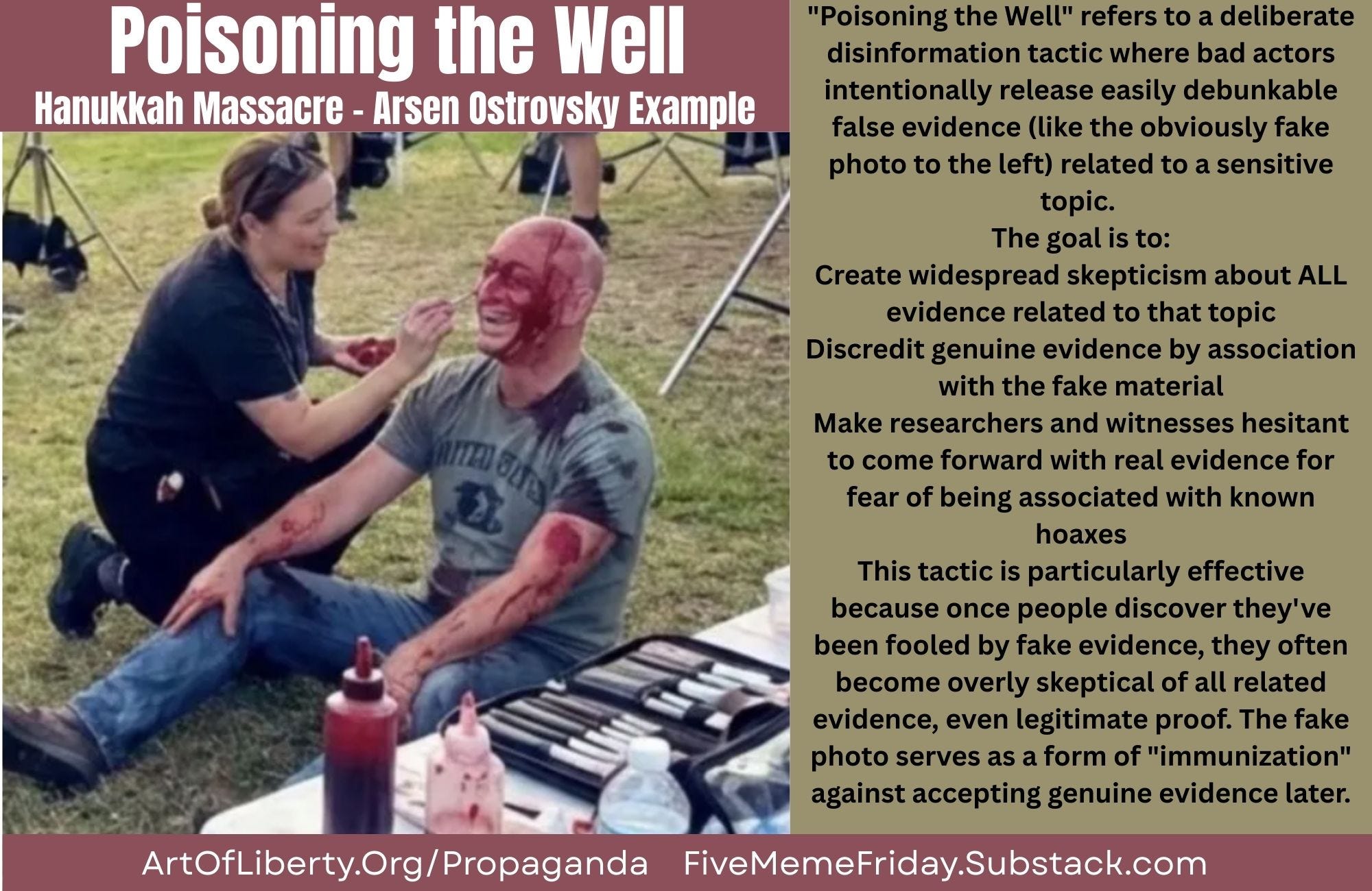 Etienne Note: In my Subscriber letter for the Substack version of Five Meme Friday that will be published at FiveMemeFriday.Substack.com after this article so it can be included, I break down more suspicious evidence especially the case of Arsen Ostrovsky, a high-level, international pro-Zionist lawfare lawyer and propagandist (Mossad?) who arrived back in Australia two weeks before the attack, just in time to get “grazed” and interviewed by international media where he made pro-Zionist /pro-Israel talking points.